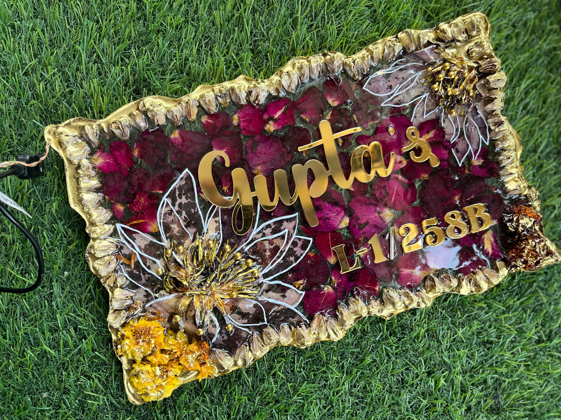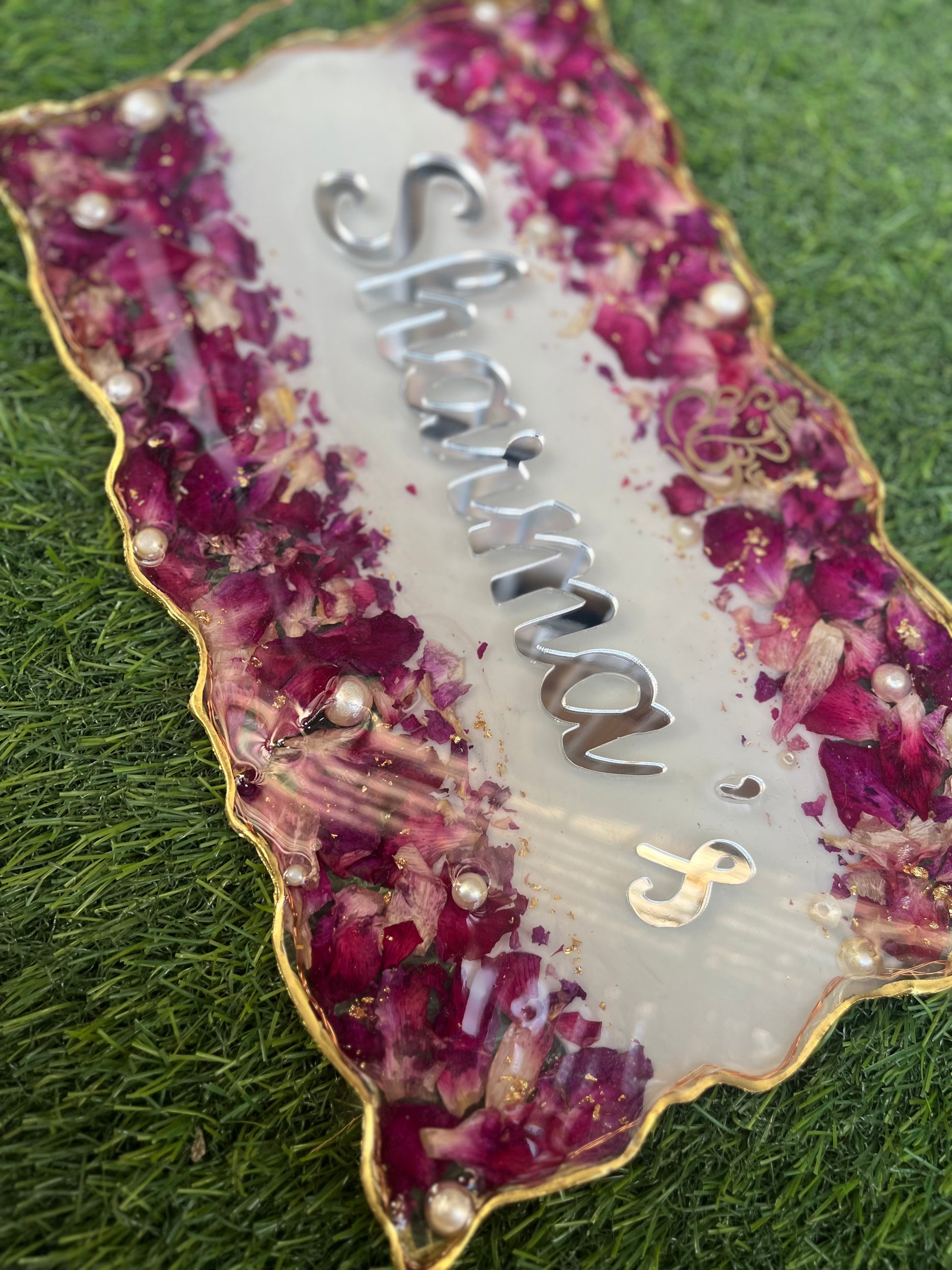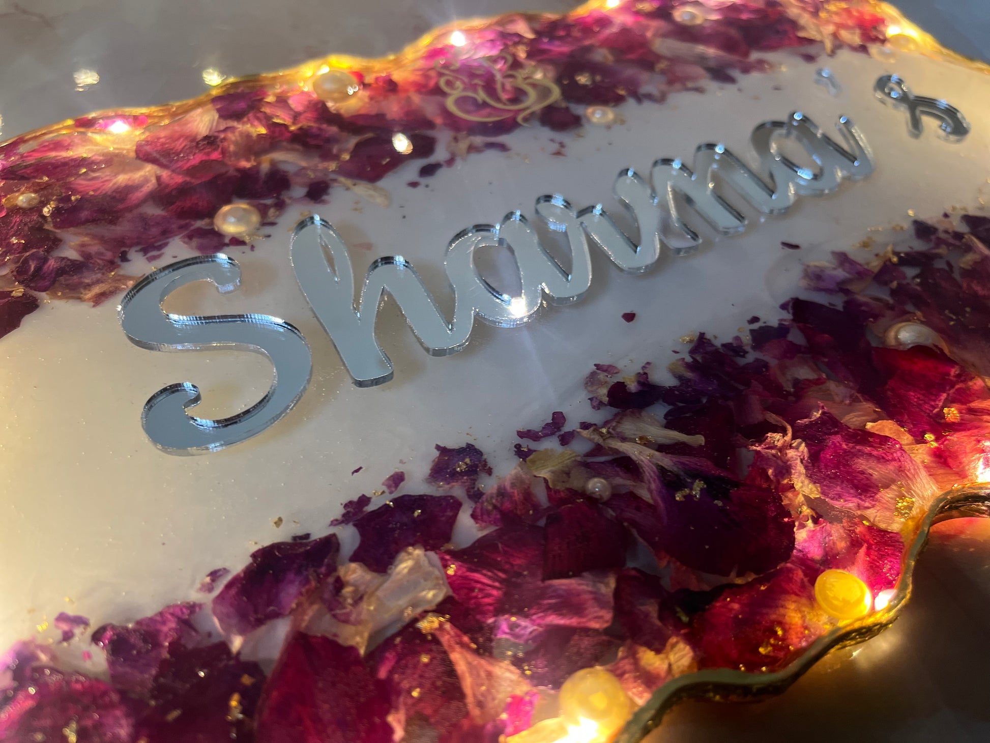 Celebrate your union with our Surname Varmala Plate with Resin — a stunning handcrafted keepsake that beautifully preserves your wedding varmala along with your shared surname. Designed with elegant resin art, floral accents, and a glossy finish, it’s the perfect blend of tradition and modern décor.