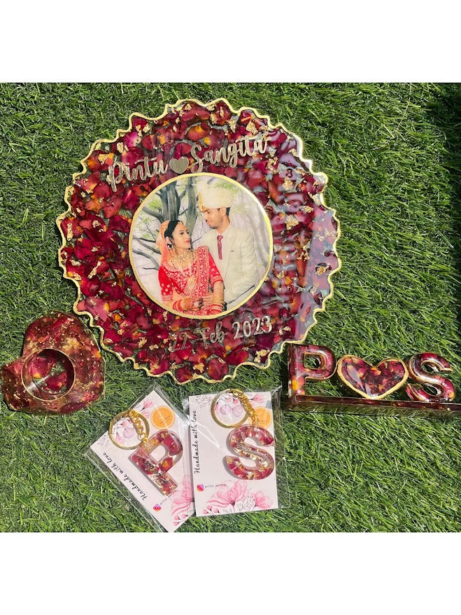 Each piece is created with premium-quality resin and preserved varmala flowers, finished with a glossy coating for a luxurious, lasting look. Perfect as a personal keepsake or a thoughtful anniversary gift.